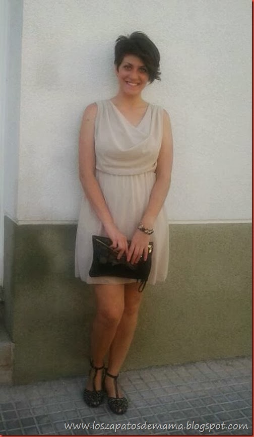Para la recepción (no sabía ni cómo sería el sitio ni quiénes eran los demás invitados ni el dress code…) a las 16h me puse un vestido nude, (de un bazar multiprecio!!!!!!!) 10€ en rebajas. Con mucha caída y cuello desbocado, con un bolso de mi madre y unas cangrejeras negras con aplicaciones brillantes, de Ulanka, un regalo de mi madre por mi santo